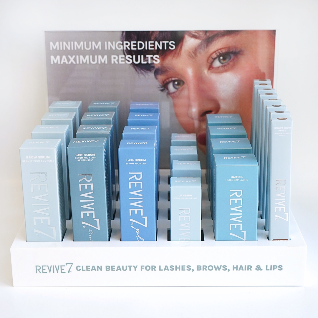 Option 1: This display offers 20 recesses that hold our best-selling products including; Revive7 Lash Serum, Revive7 Plus Lash Serum, Revive7 Brow Serum, Revive7 Mascaras, and all Revive7 Lip Serums.